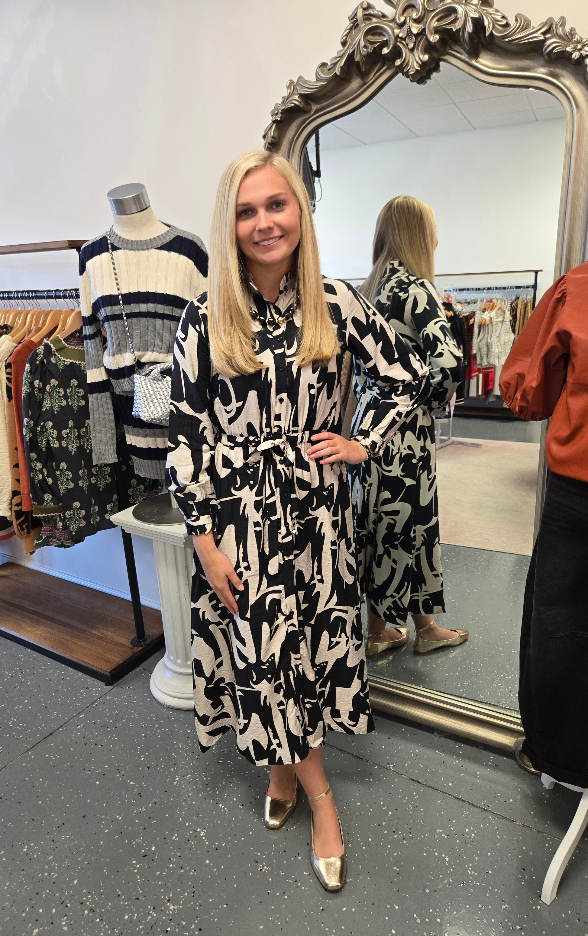 Abstract black and white printed midi dress with a self tie front.