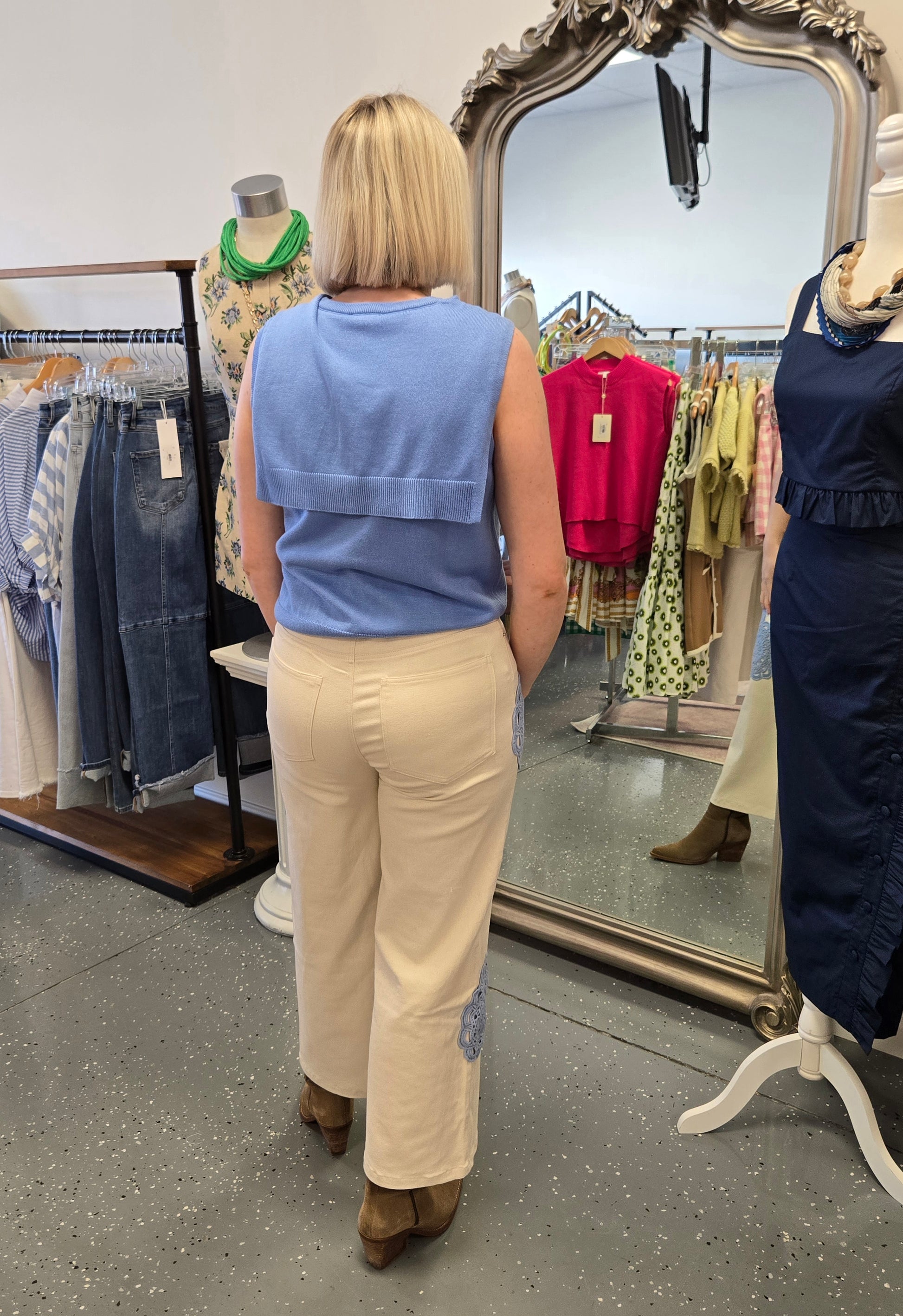 - Solid sleeveless knit top featuring self tie scarf accent.