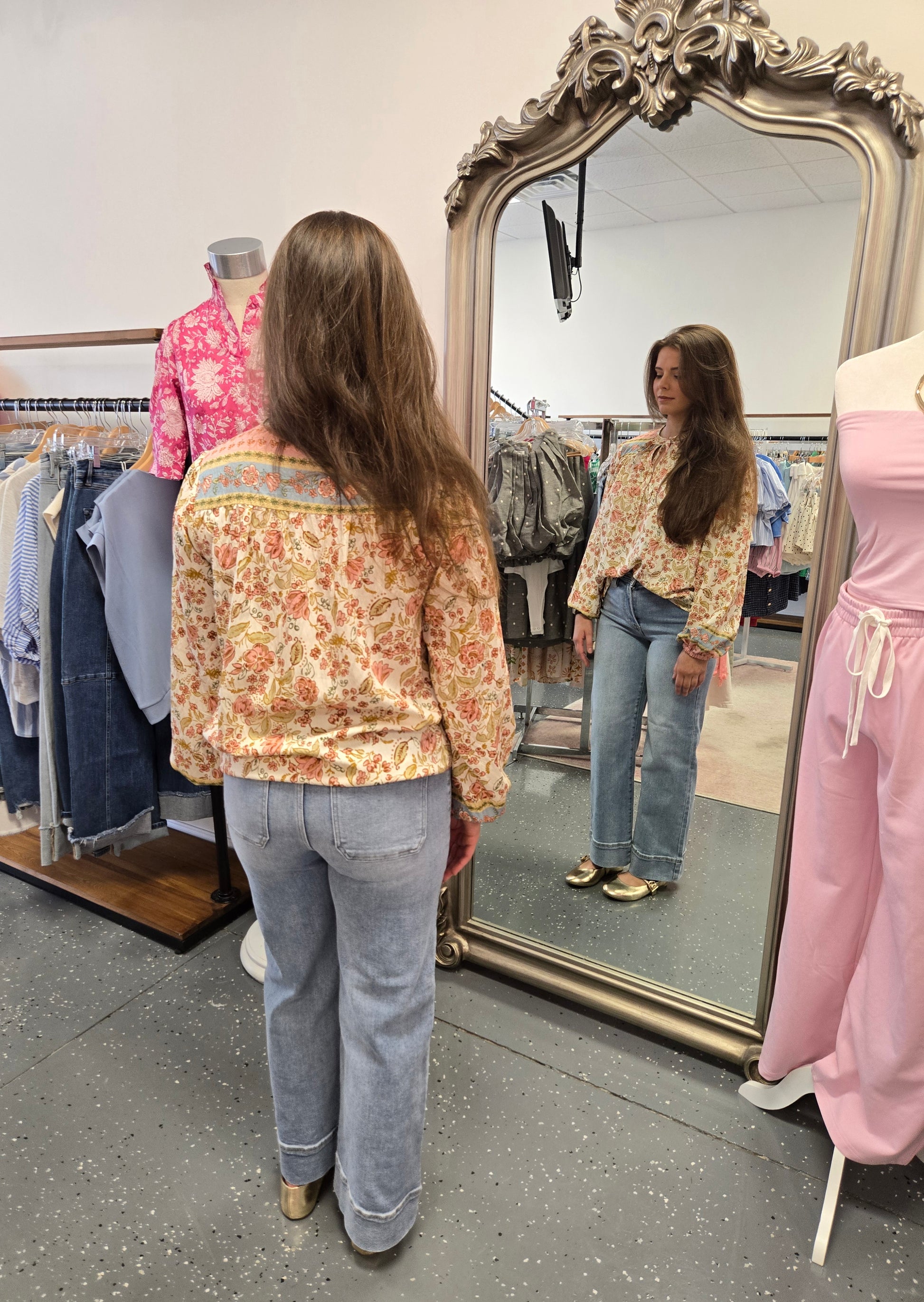 Long sleeve floral blouse with a self tie front. Light weight flowy fit.