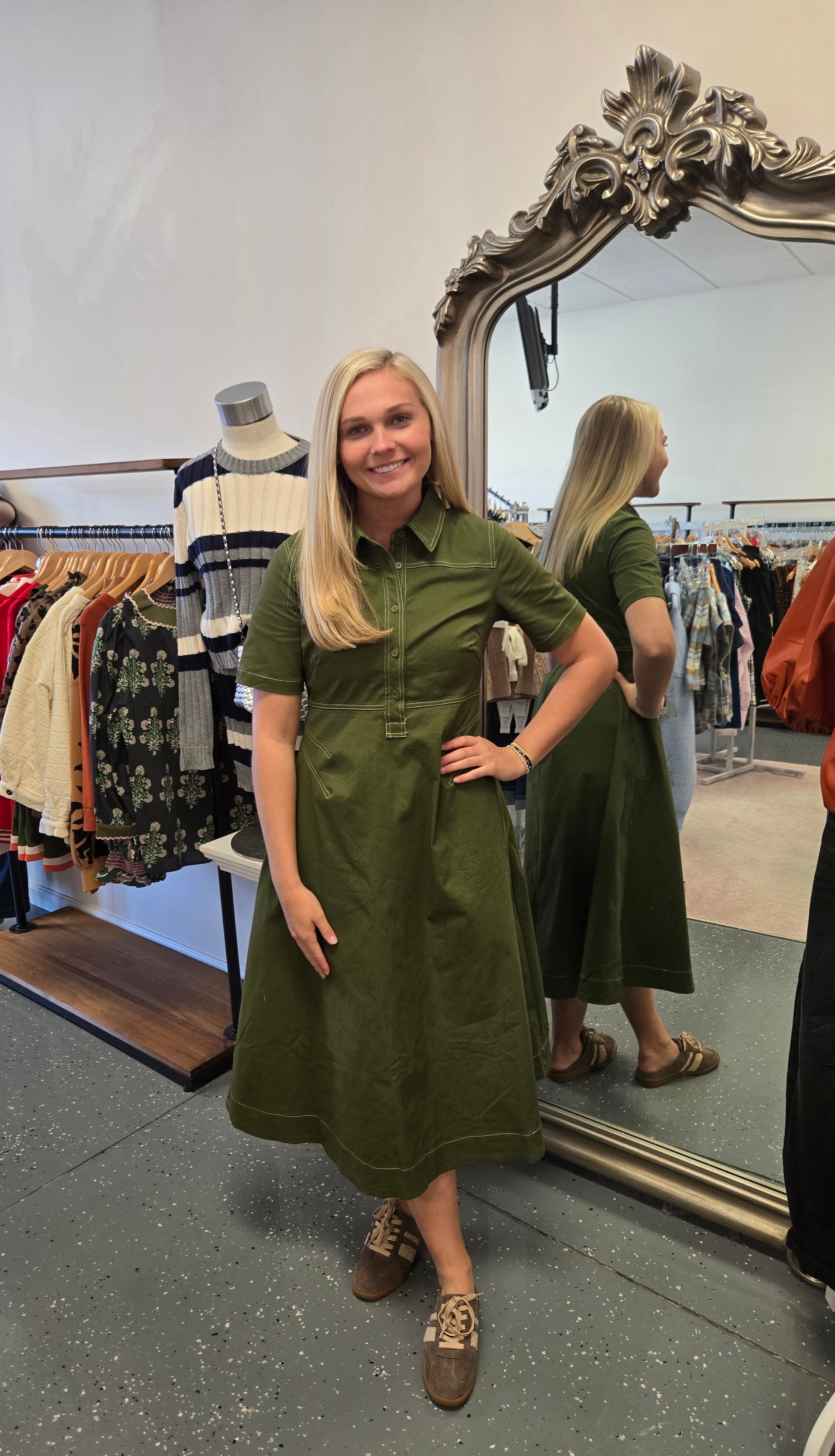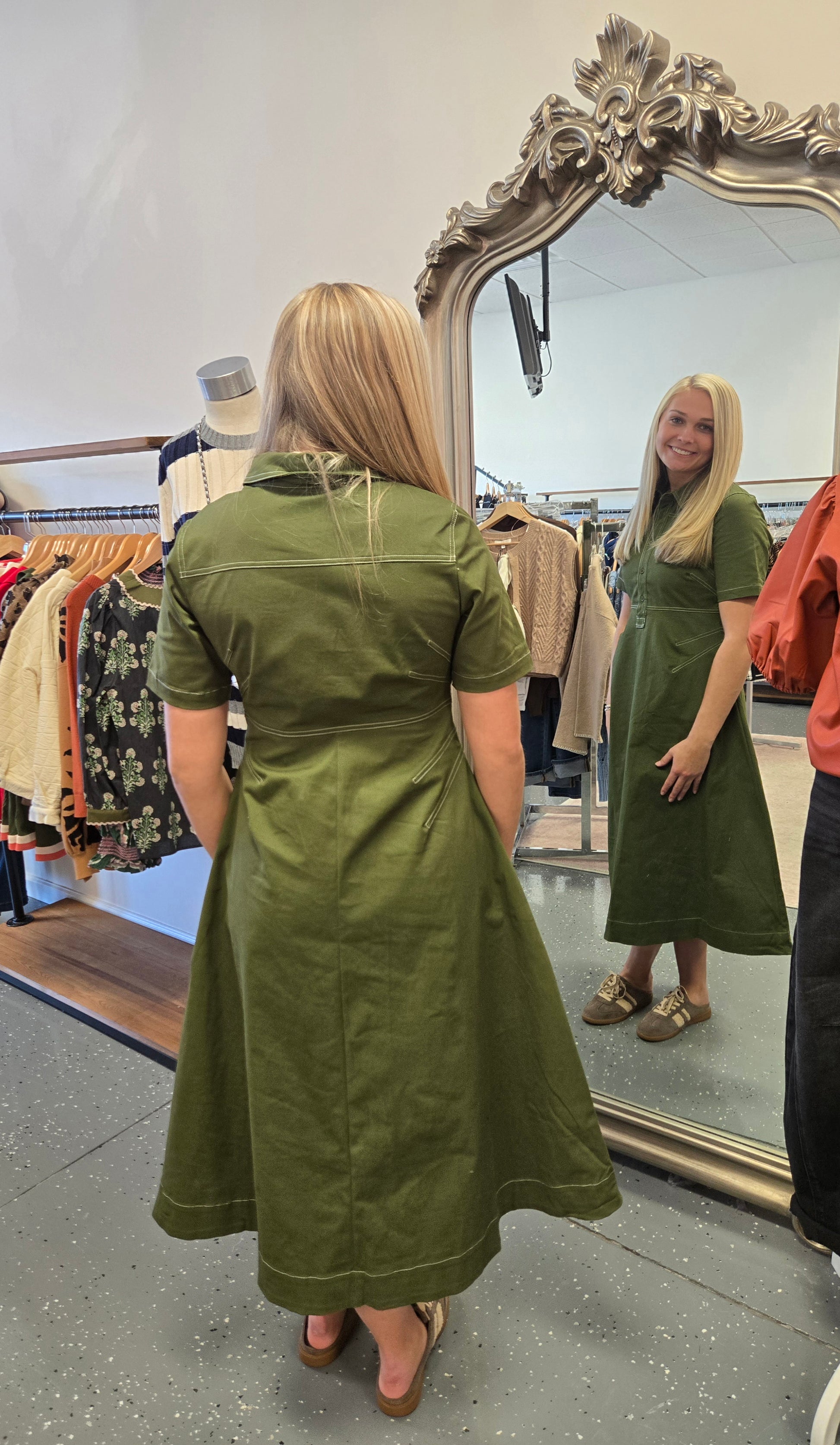 * A olive midi dress with stitching details along dress. Side pocket details.