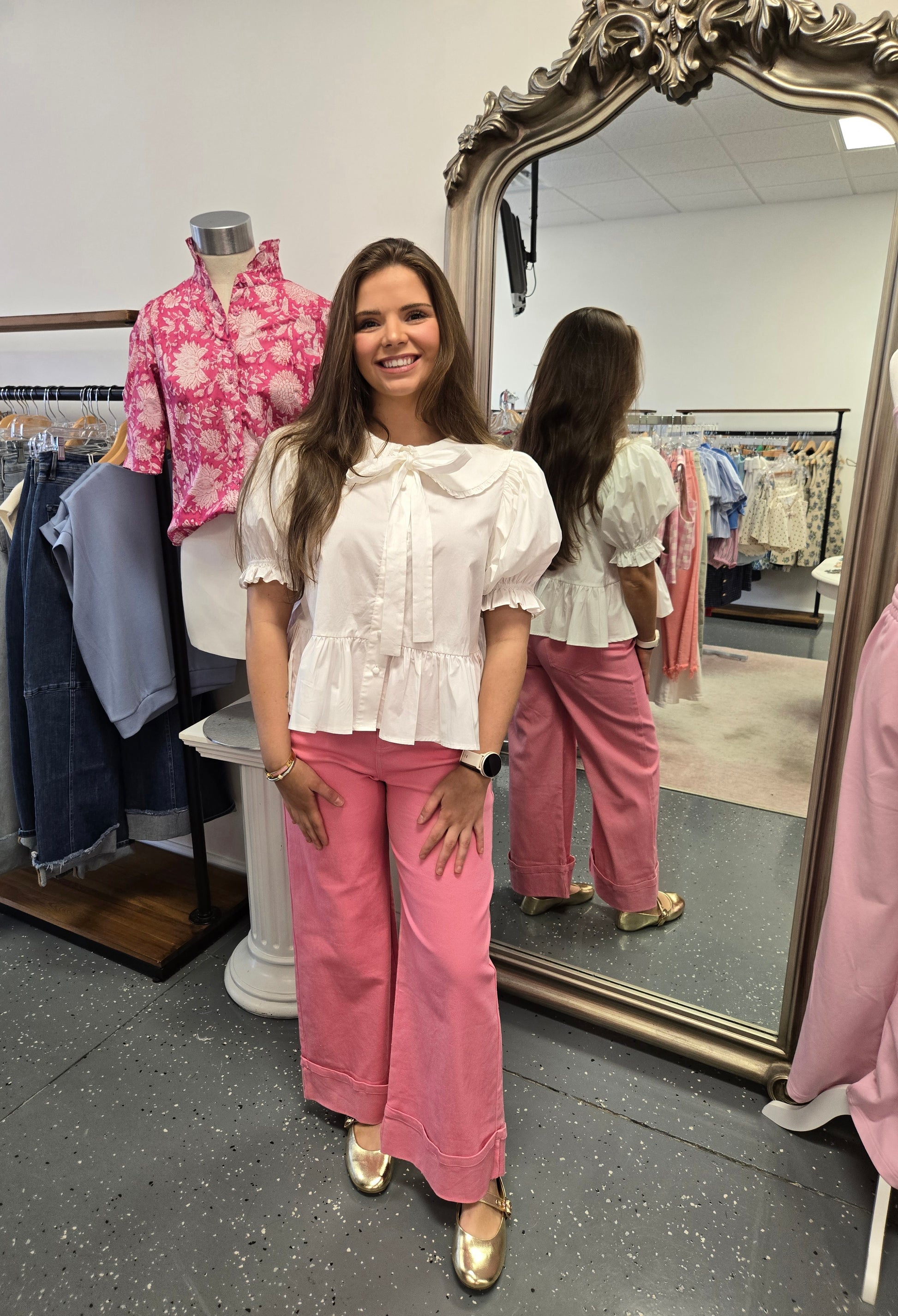A sweet and playful blouse for casual days or dress it up for a night out! Features lace details, Peter Pan Collar, fully button down and elastic band on the sleeves.