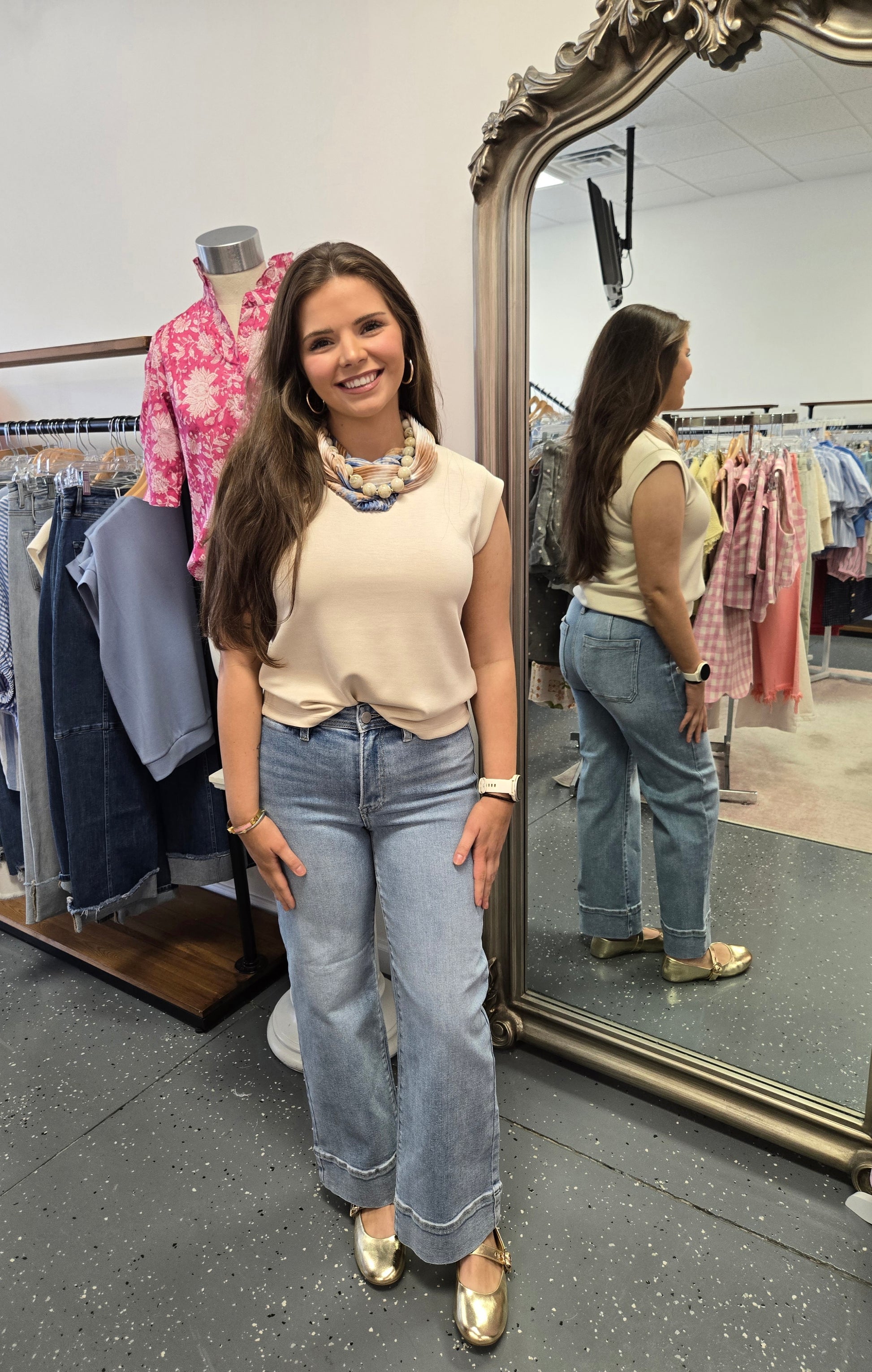 Sleeveless ivory scuba tee. Comfortable relaxing fit.