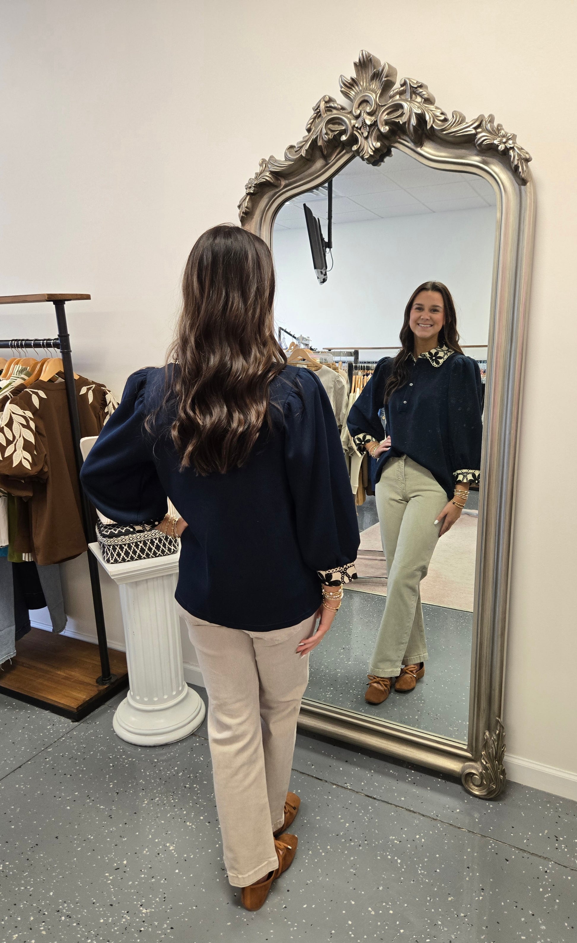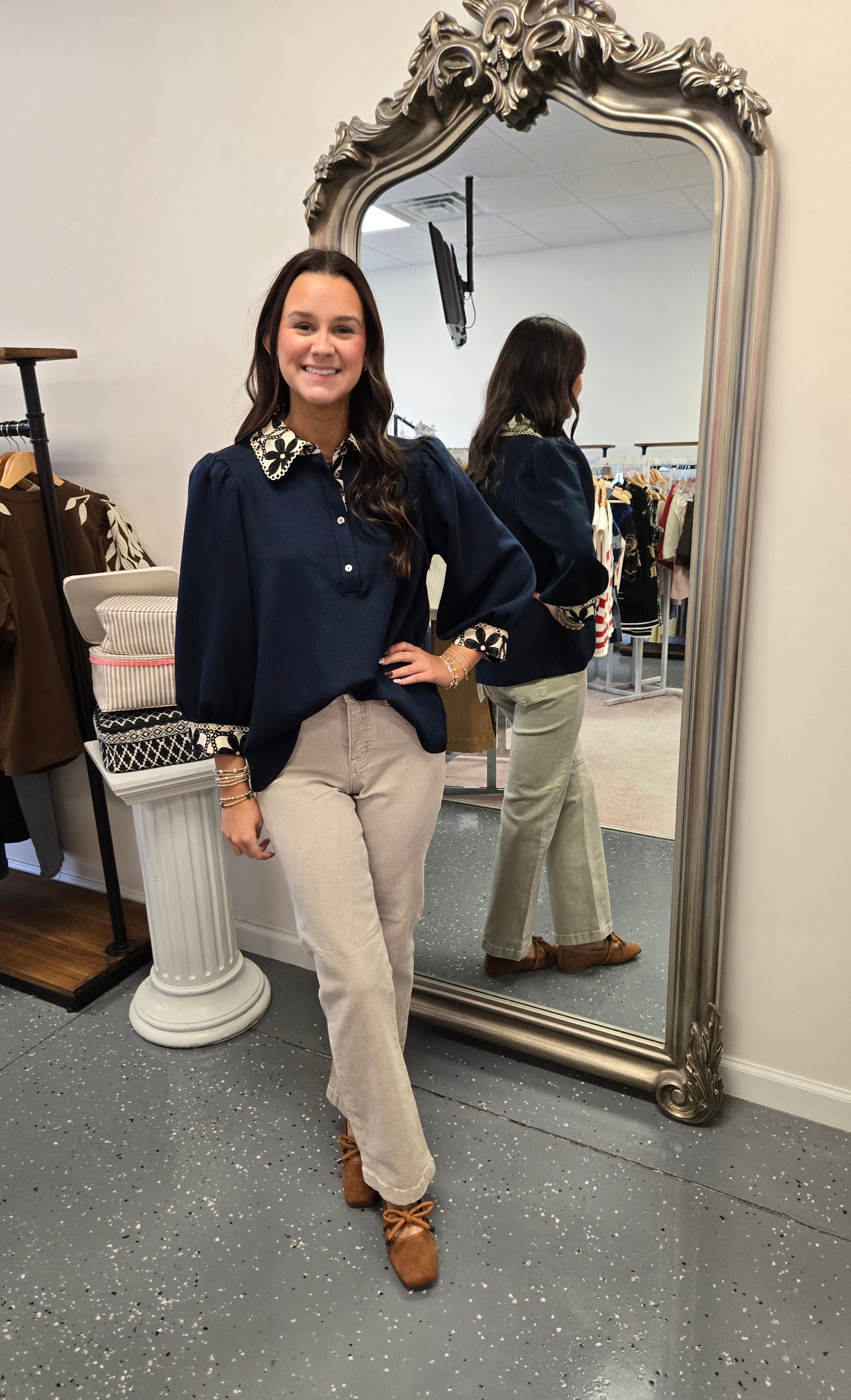 - Featuring floral lace contrast around the collar and sleeves.