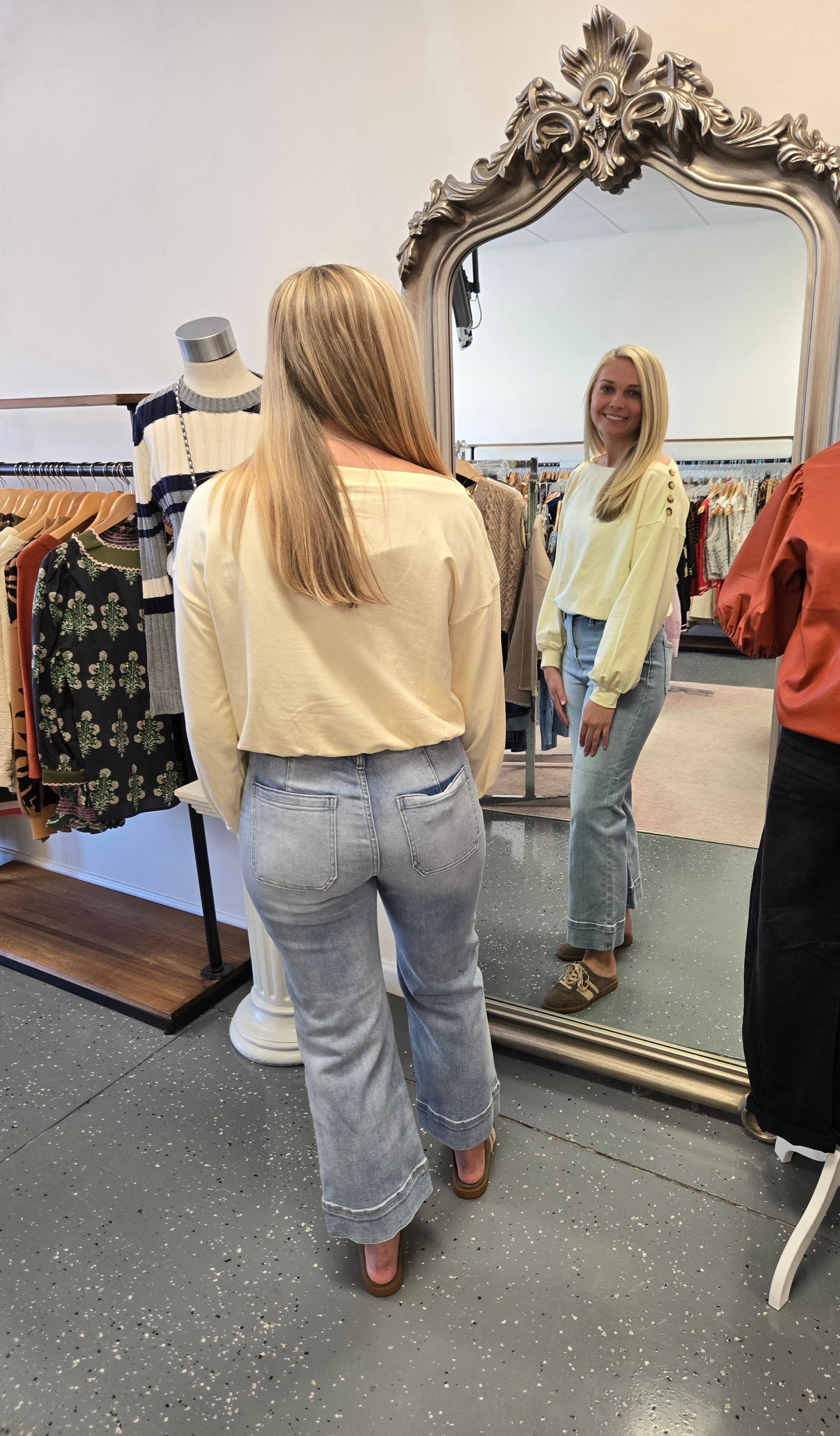 * Pale yellow cotton long sleeve top with button details on the shoulders.
