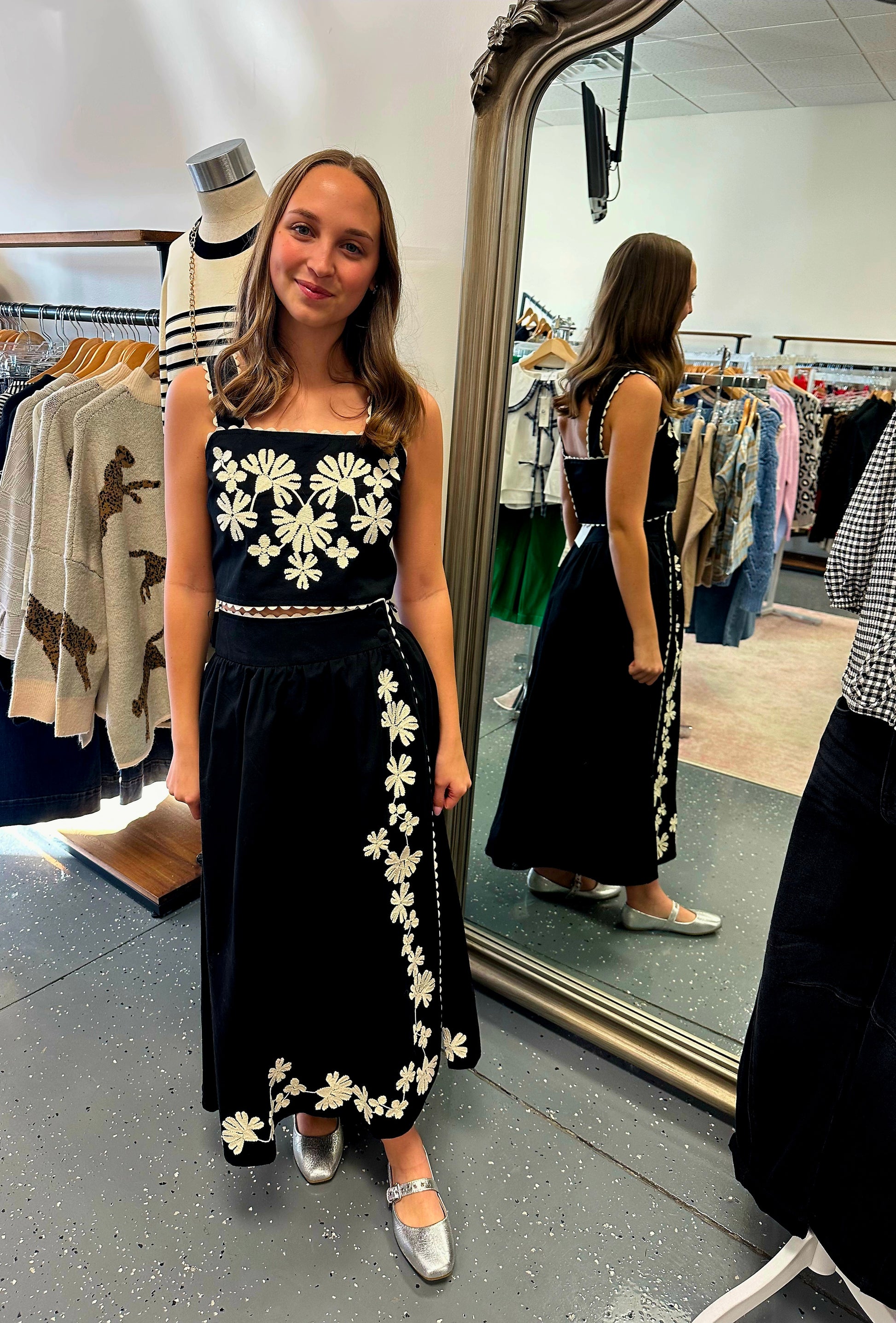Embroidered two piece midi skirt set featuring all the details you could possibly want!