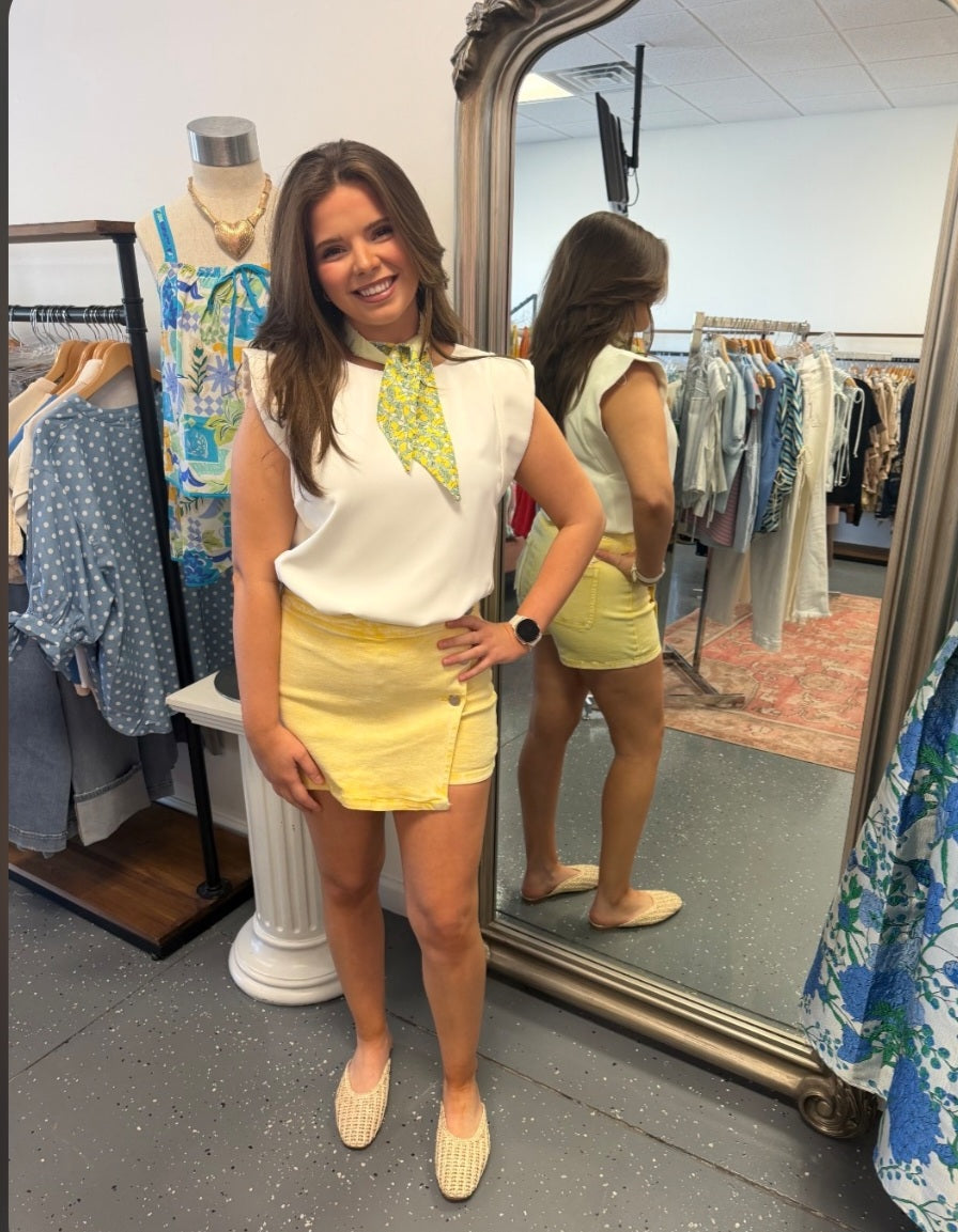 Sleek and sophisticated, this structured top brings timeless elegance to your everyday wardrobe. The clean ivory silhouette features subtle shoulder detailing for understated edge, paired with a tailored fit that flatters and polishes any look. Side slits provide ease of movement and styling versatility—wear it casual with denim or elevate it for refined occasions. A wardrobe staple designed to transition seamlessly from day to night.