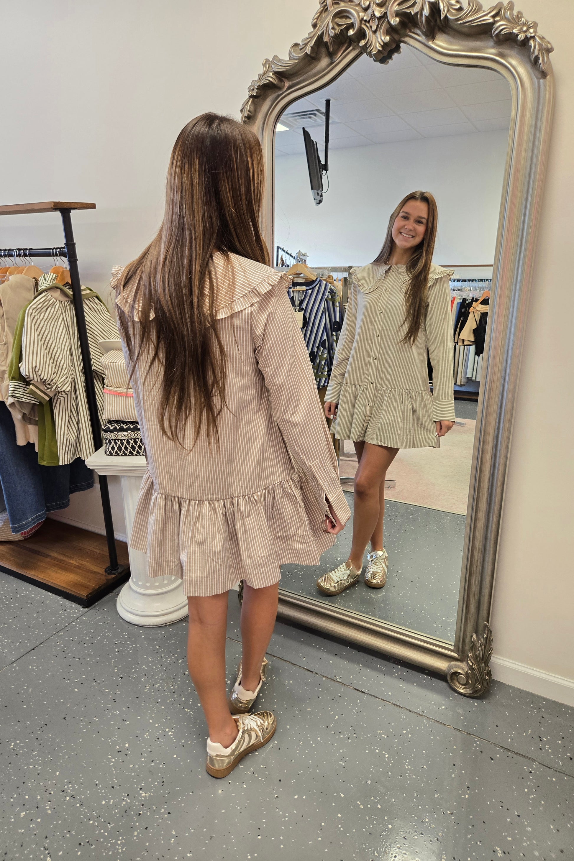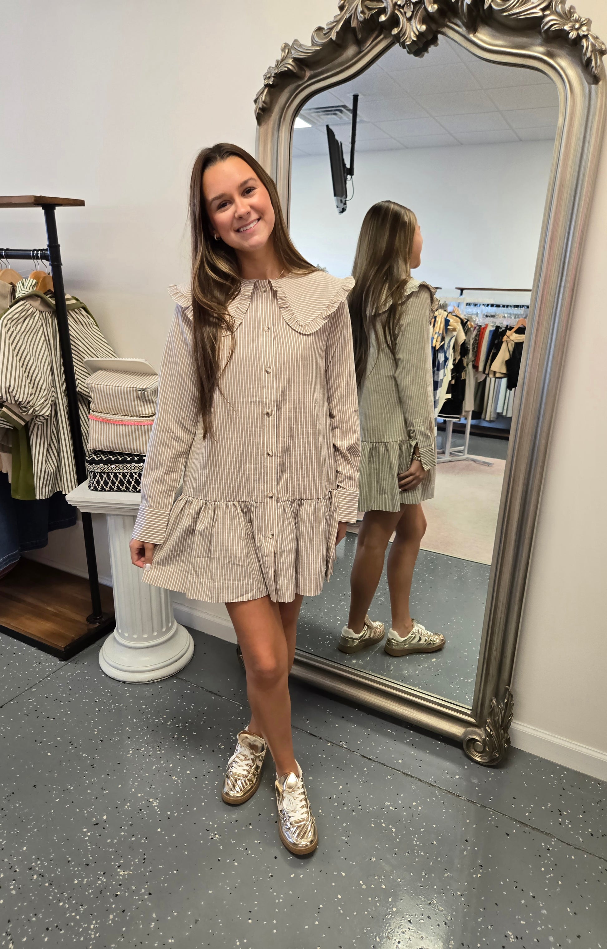 Striped mini dress featuring a Peter Pan Collar and a ruffle tiered hem.