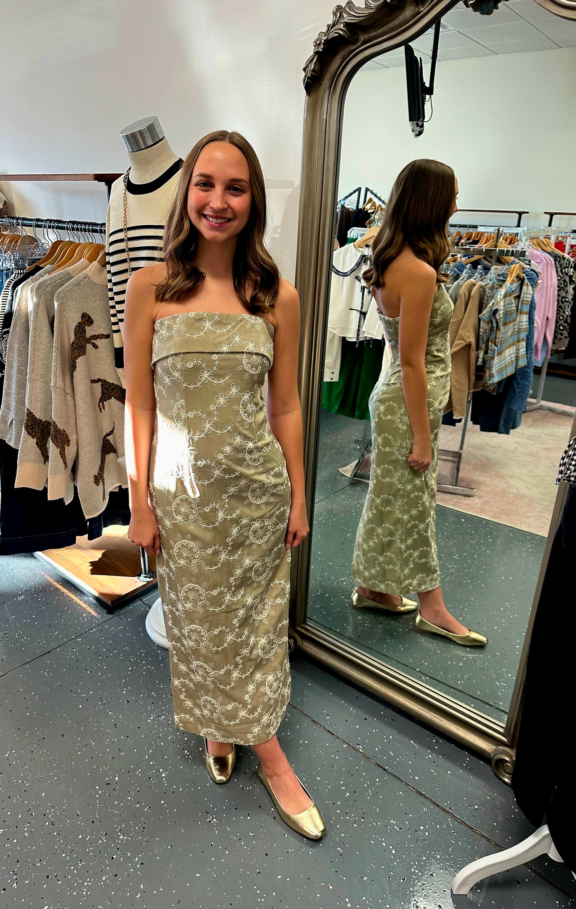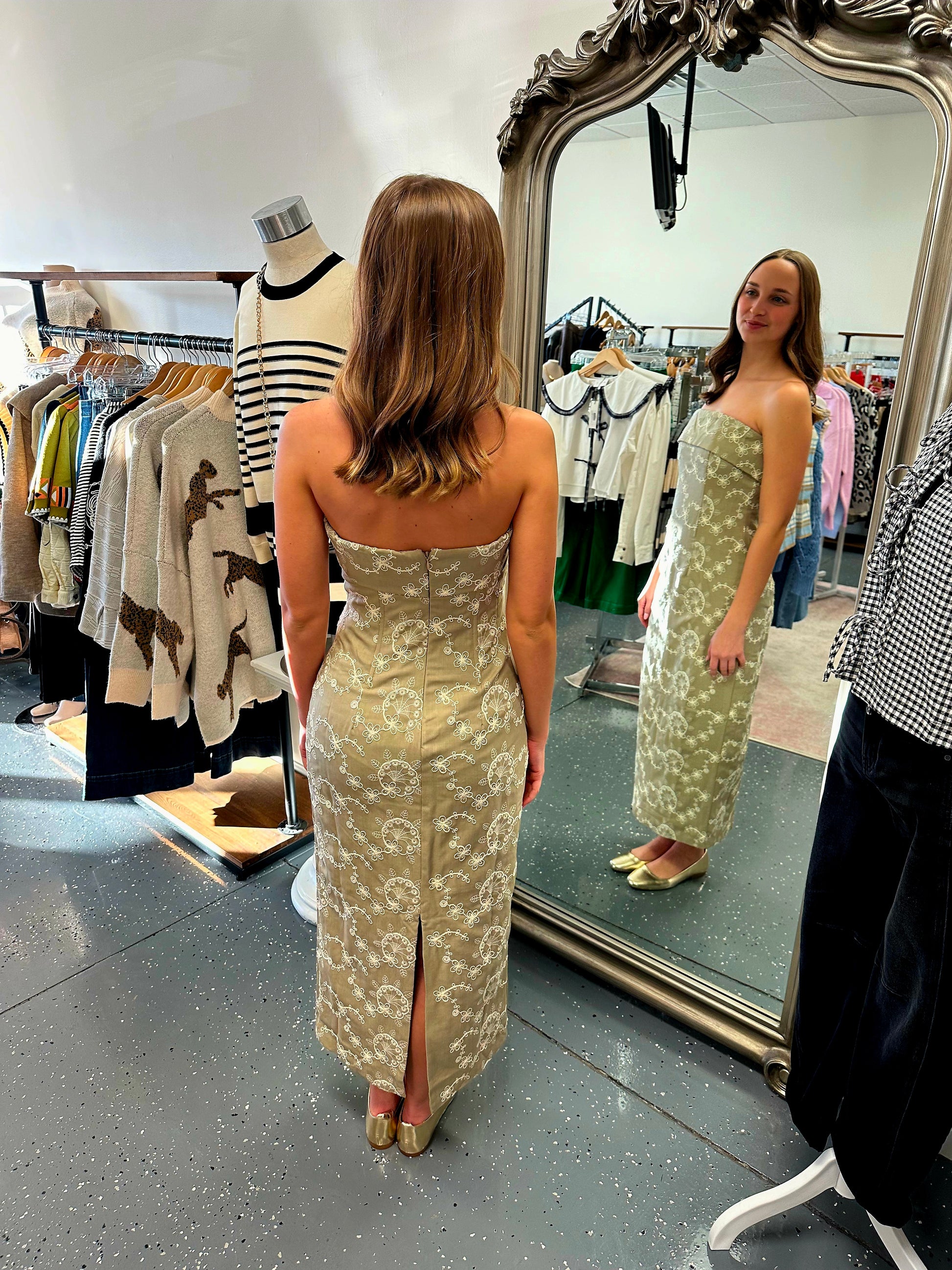 * Tan strapless midi with ivory floral embroidery details.
