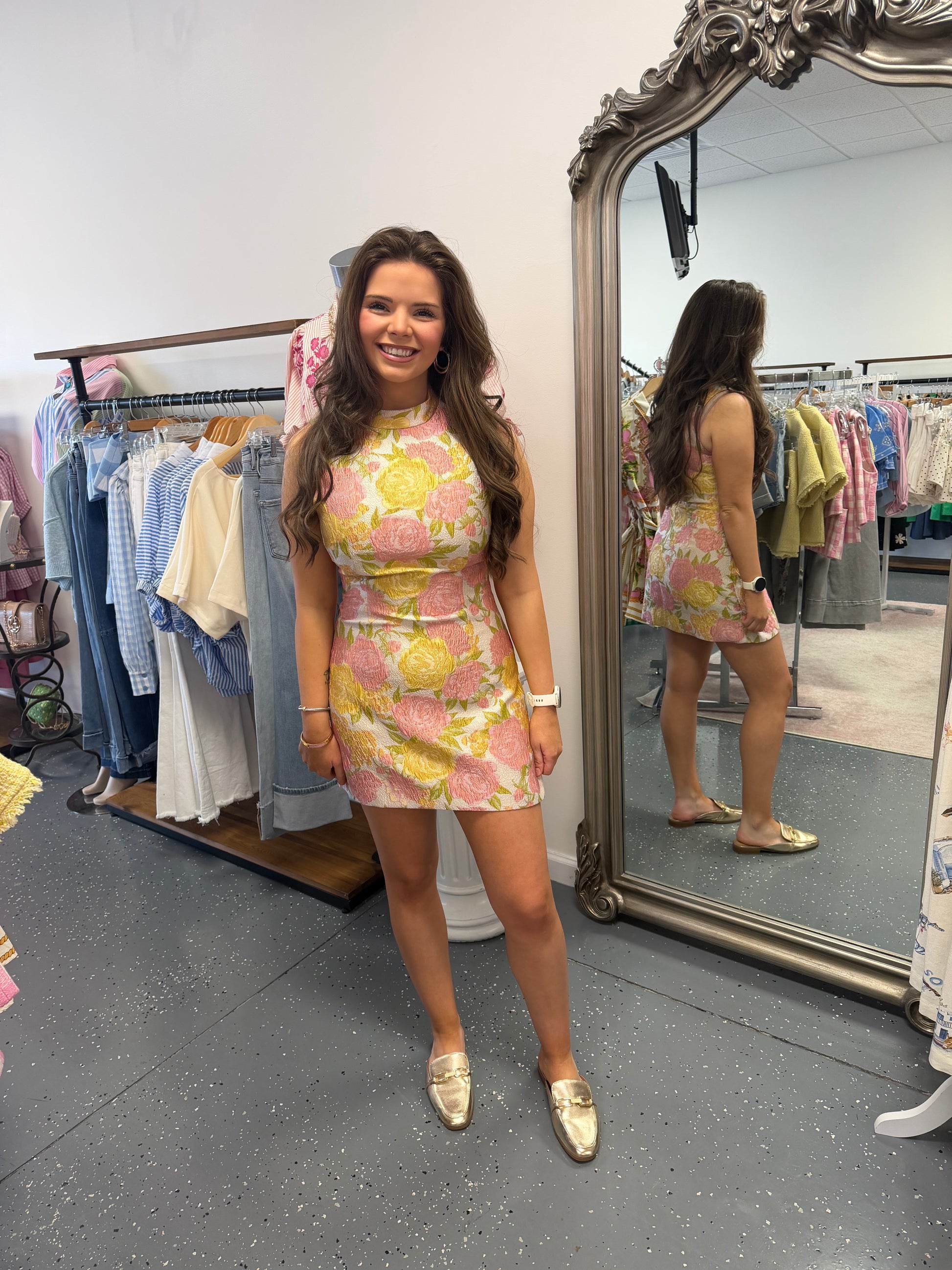 - Multi color jaquard mini with a floral print.
