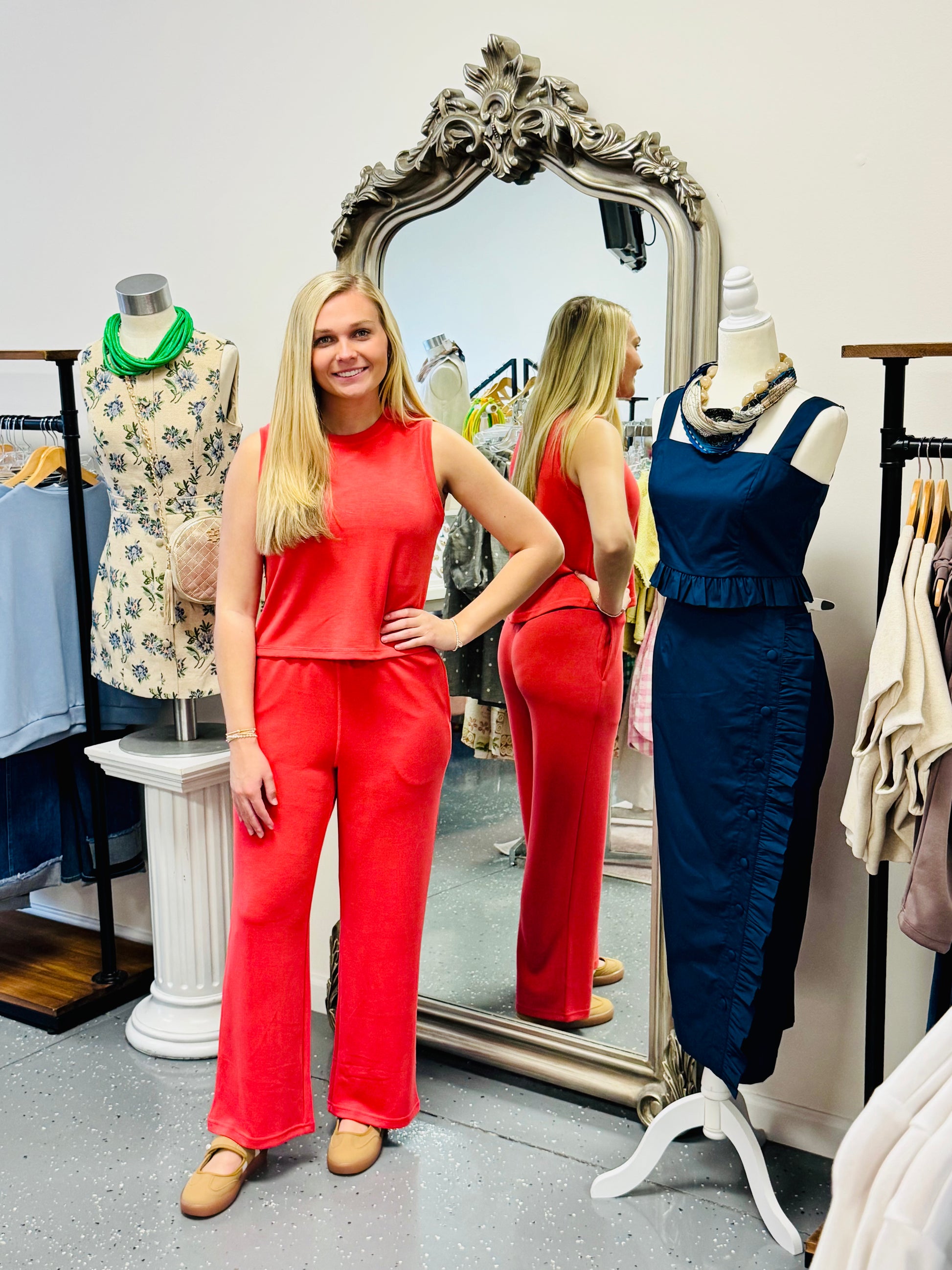 - Buttery soft, lightweight scuba fabric tank with matching pants.