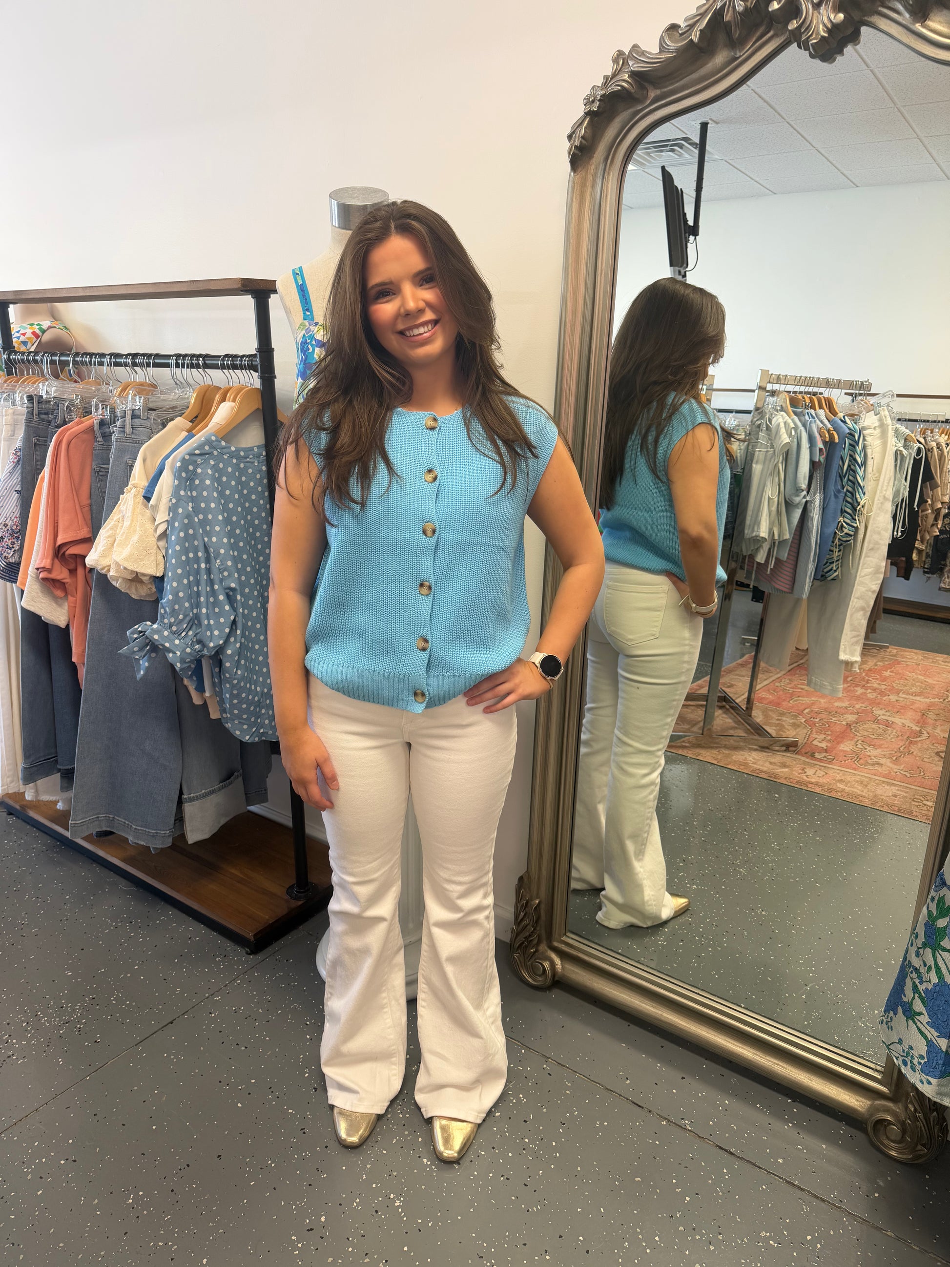 A fresh pop of color your closet needs. This sleeveless blue knit top features a soft, lightweight feel with a flattering cropped fit and delicate button-front detail. The ribbed trim adds just the right touch of structure while keeping it comfy and easy to wear. Style it with denim shorts for an effortless everyday look, or pair with white denim for a crisp, spring-ready outfit. Versatile enough to layer or wear solo, this piece transitions seamlessly from casual to polished.