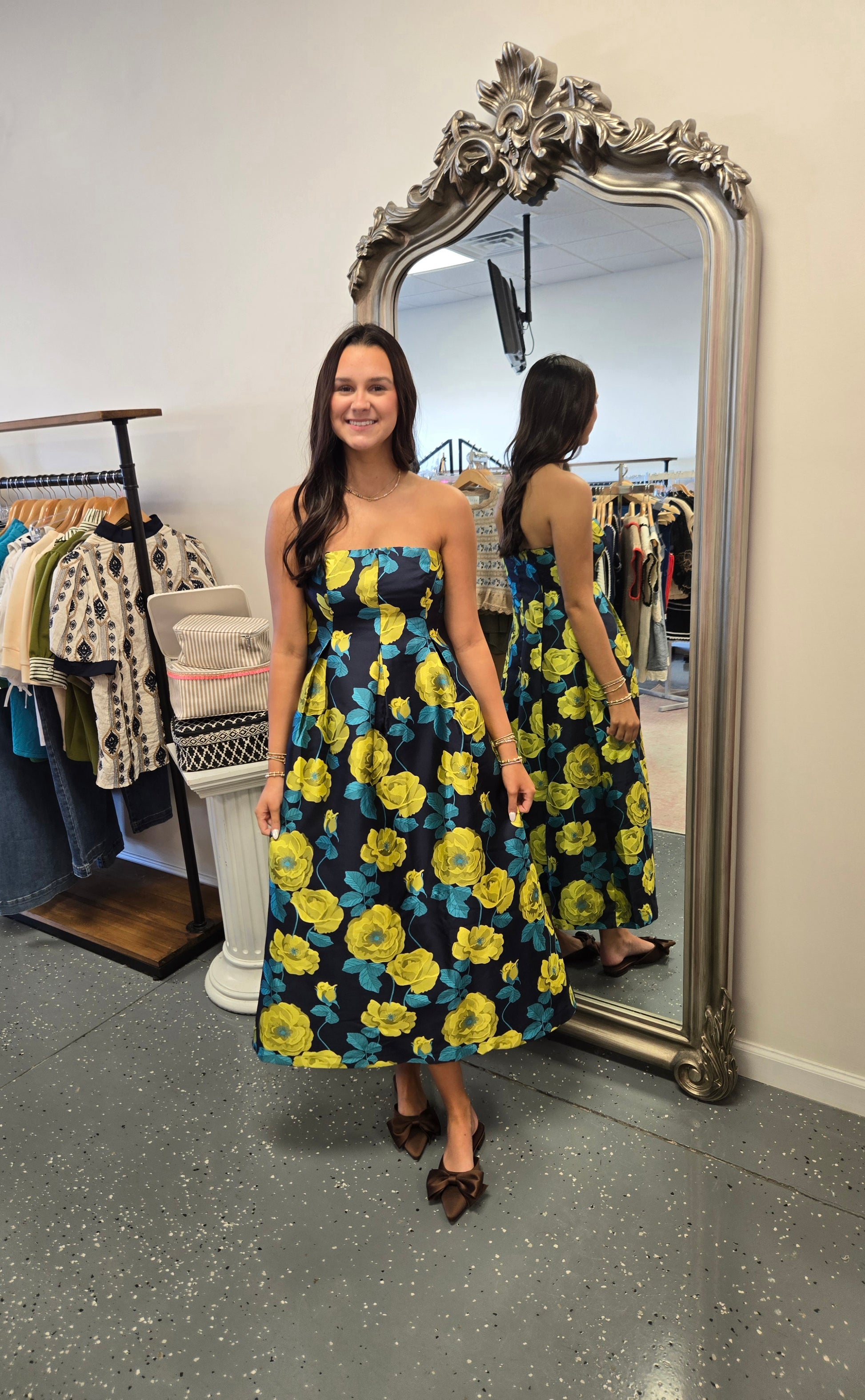 - Strapless pleated details jacquard floral midi.