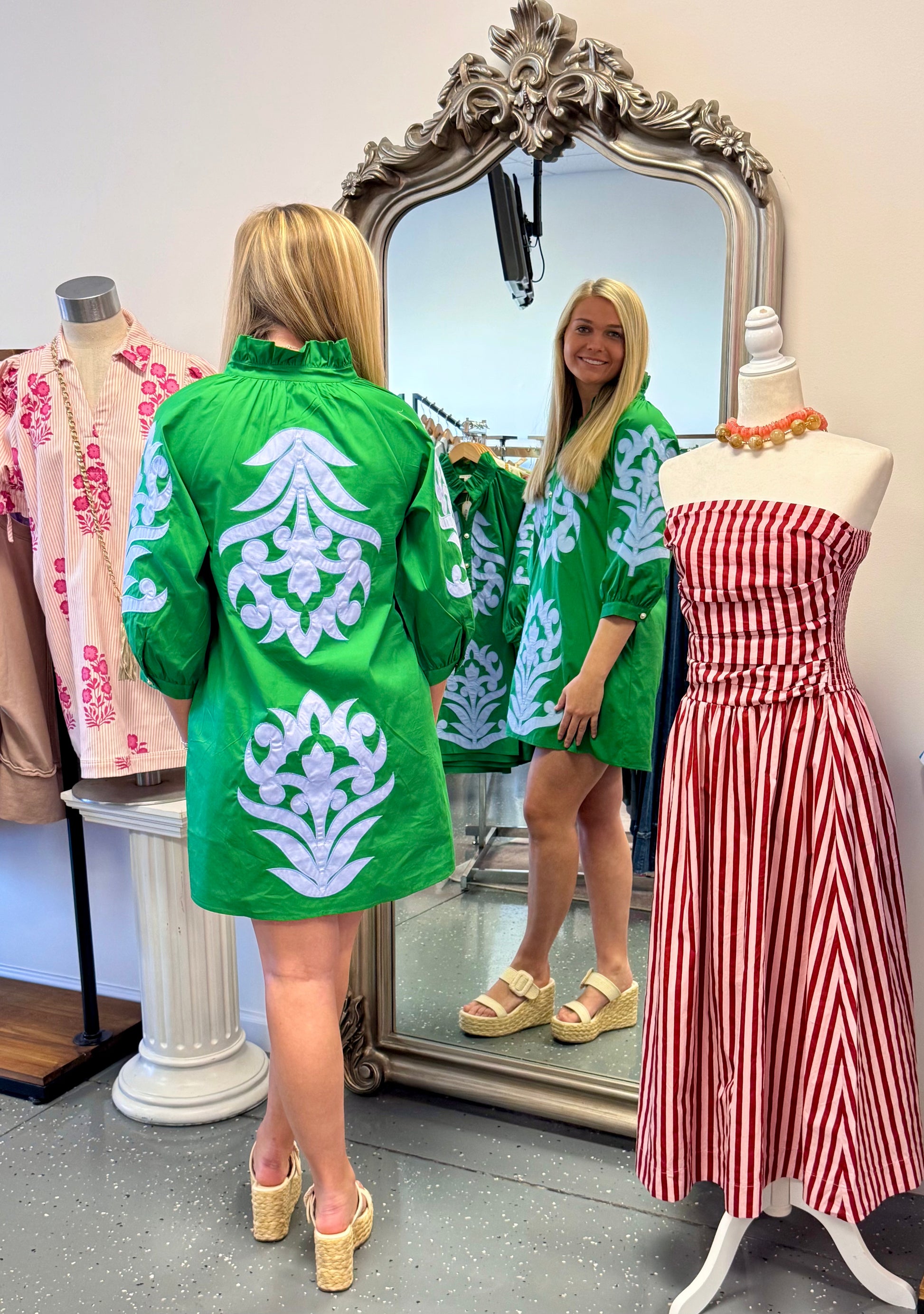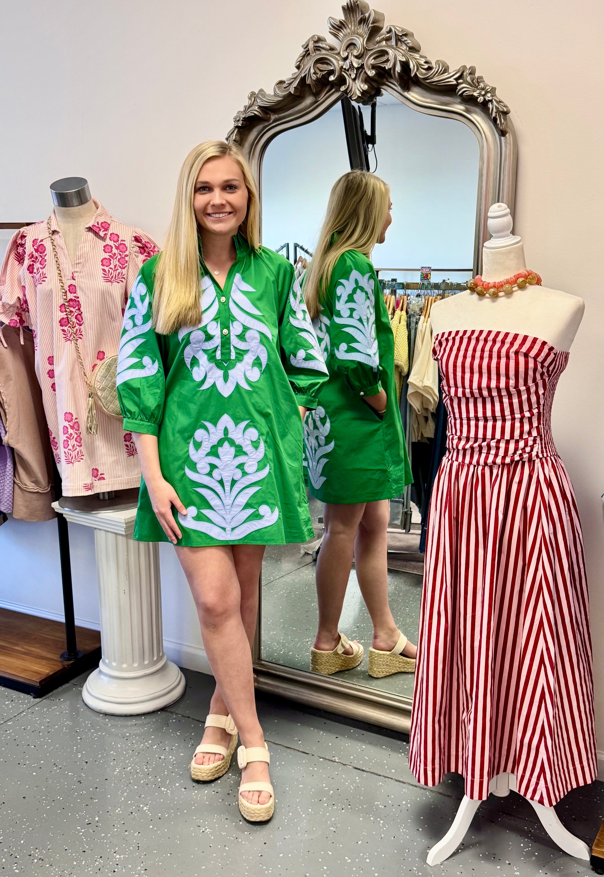 - Green quarter length mini with blue floral details on the front and back of dress.