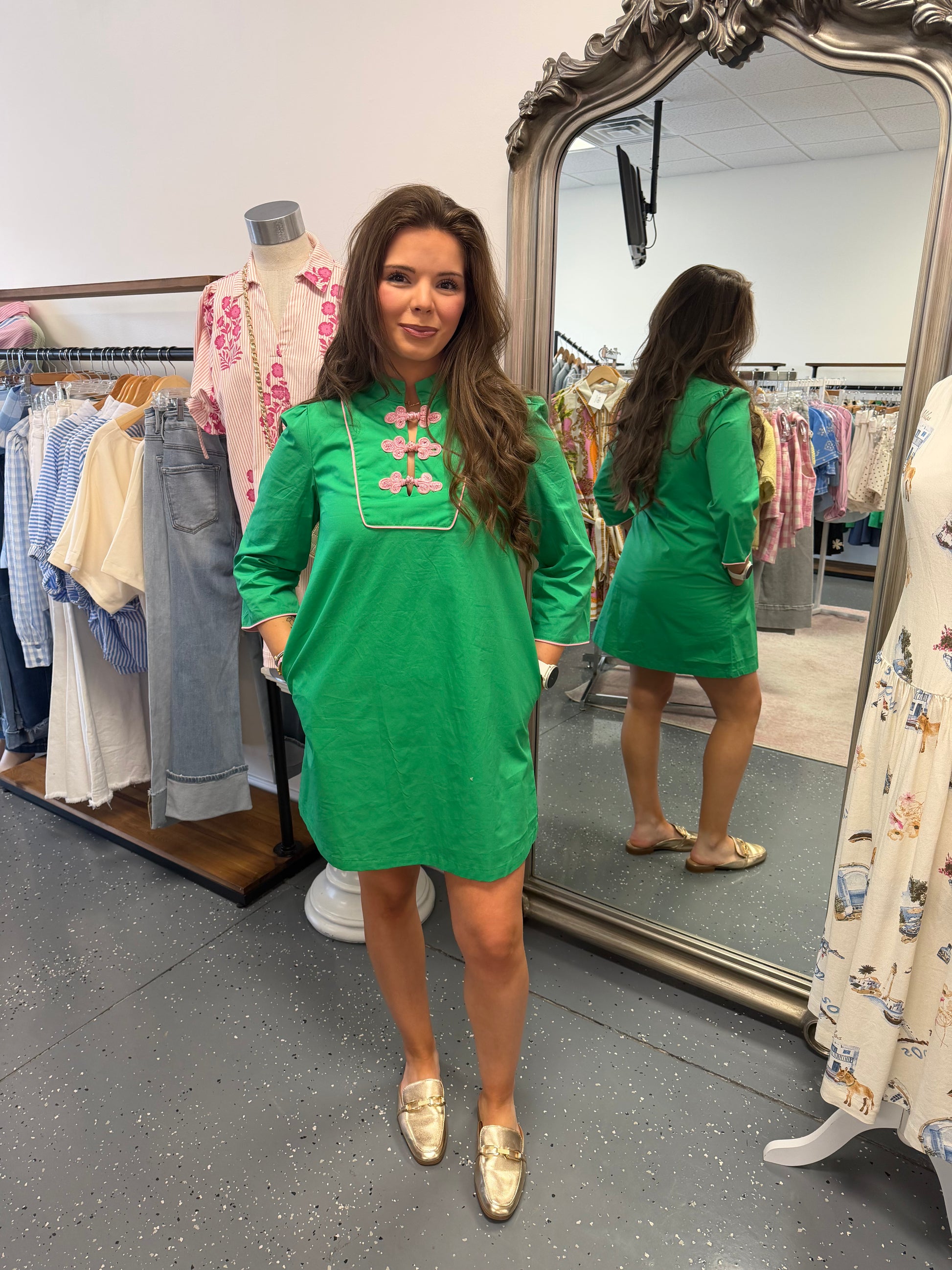- A mini shift dress in green.