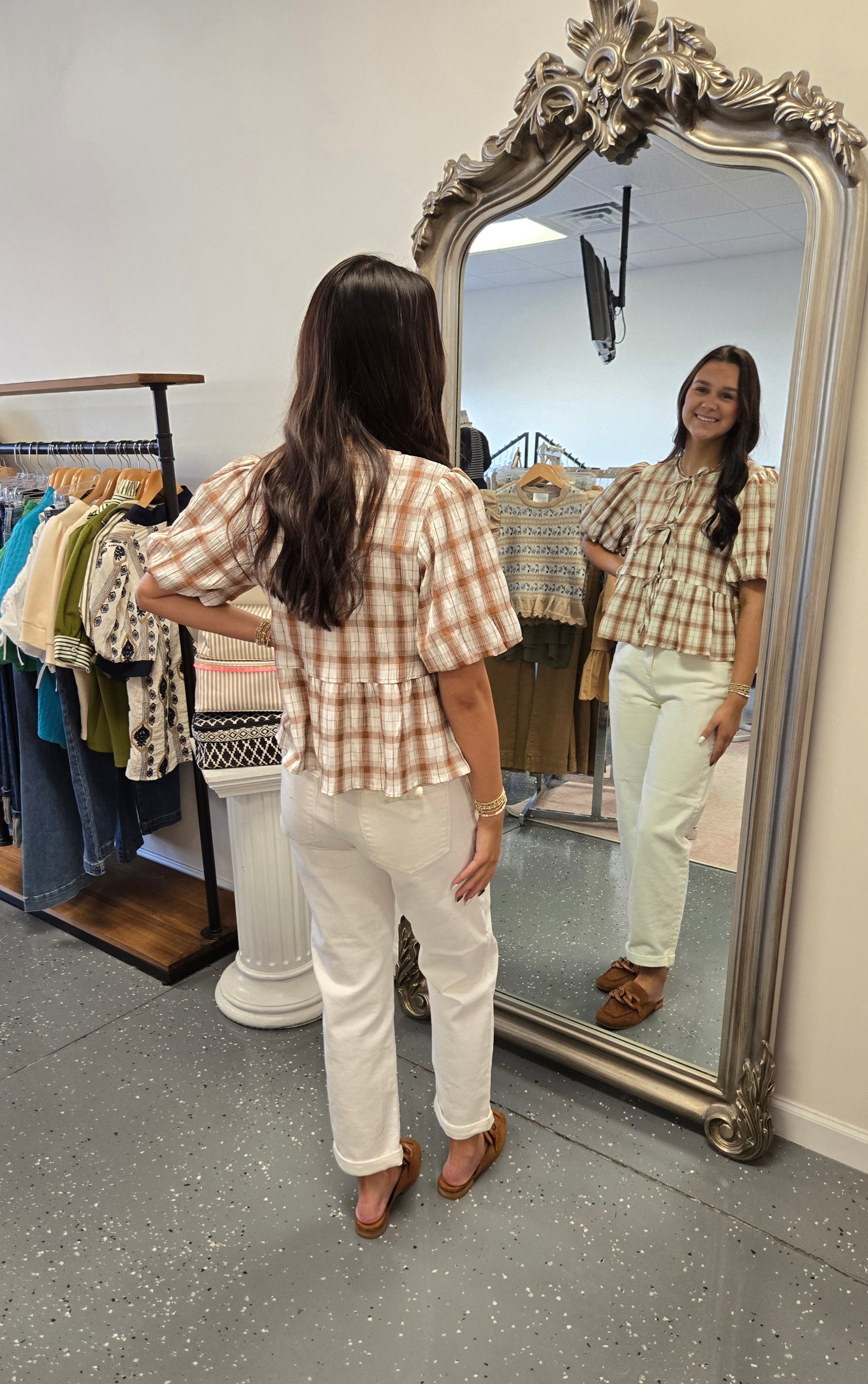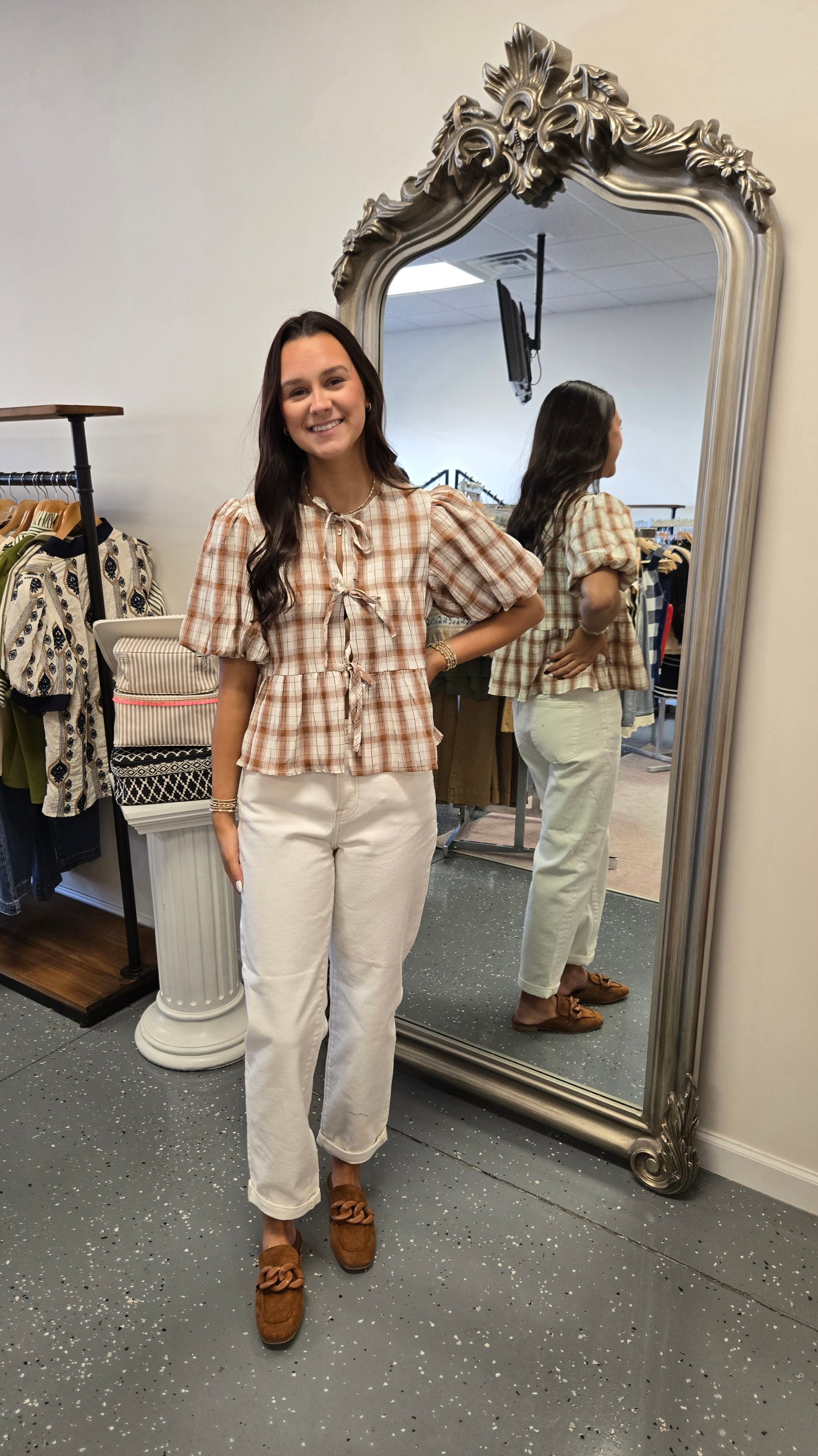 - Brown and Ivory plaid bubble sleeve top with self-tie front.