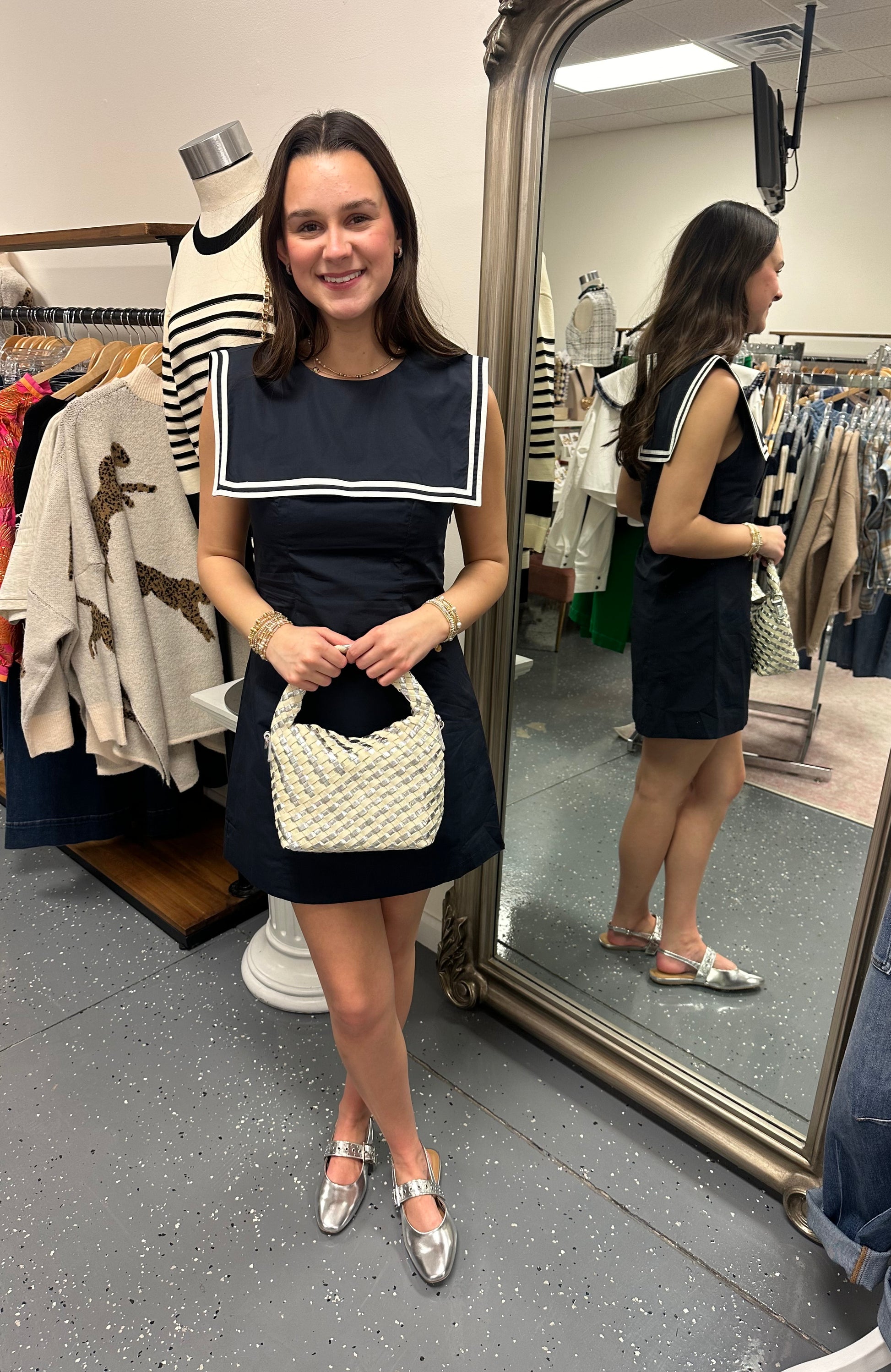 - Navy sleeveless square sailor collar with white lined details mini dress.